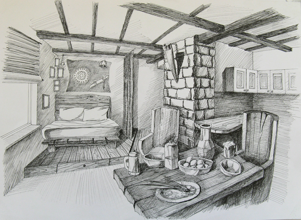 Оттуда же, сделано на пару недель раньше. Задача - передать фактуру материалов линерами. Мы со старостой опять взяли одну и ту же картинку, как с храмом, только этот вариант не сложный, все линии от руки (и от балды), можно просто расслабиться и поводить линерами по бумаге (например, на лекциях)