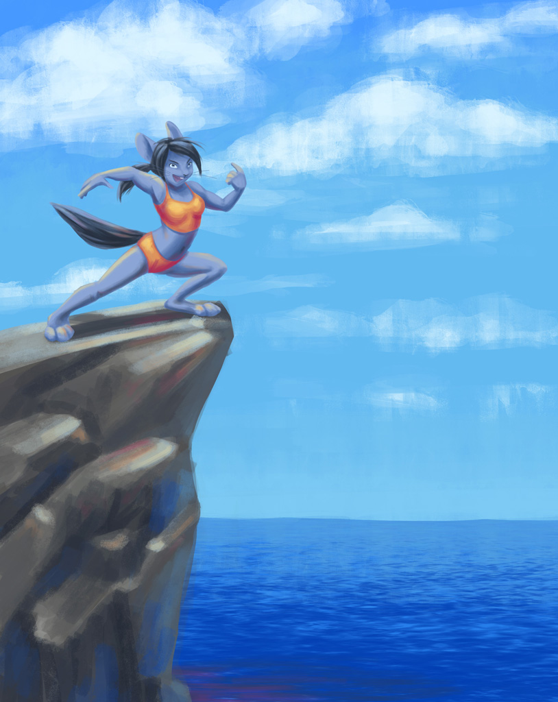 Кстати, ещё кое-что. Выучила из урока с дА, туториал от потрясающей художницы, который, я конечно же, теперь никогда снова не найду... Если красишь под реалистику, нельзя оставлять большие участки одноцветными, везде должны быть свет, тень и рефлексы. Т.е. на последней работе на ближнем ухе и ближней ноге (больше всего заметно) идёт с одной стороны свет, с другой тень. Нужно, чтобы всего было везде, иначе смотрится плоско. Волосы на голове и хвост хорошо и объёмно покрашены, скала тоже неплохо за исключением некоторых моментов, море вообще потрясающее (неужели вручную рисовалось?).