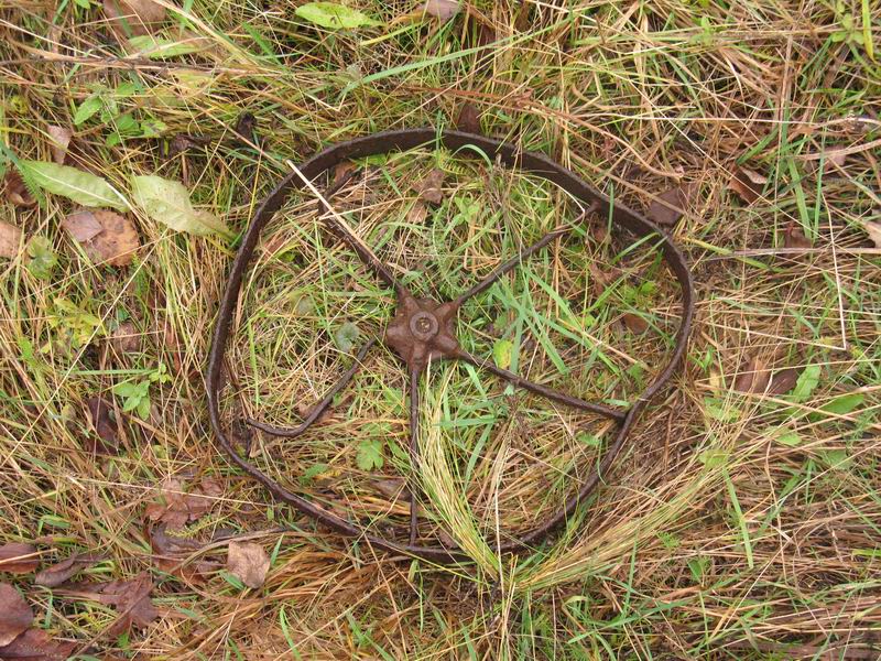 У дороги оборудована площадка для костра, которой мы решили воспользоваться. Напилив мокрых дров под периодически моросящим дождиком, разожгли костер, хотя была мысль почитерить и пожарить сосиски на одной растопке. Перекусив, осмотрели кладбище, дошли до места, где была деревня. Видели Газ 66 с камуфляжной раскраской, круживший по лесу (охотники что ли), померили глубину найденной лужи на месте встречи дороги и ручейка, я по телефону уточнила у Грифона отсутствие поблизости тайников (да, это все геокешинг не отпускает), после чего мы посчитали свою миссию выполненной.