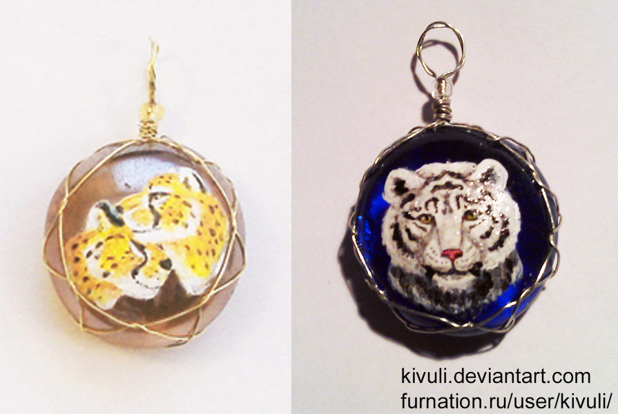 Оплетенные и расписанные на фурьке на мастер-классе Саурон стеклышки. Гепарды — для гепардового флешмоба и поприкалываться над Саурон, которая тоже двух персонажей рисовала на одном кулончике. Тигр — на заказ. Слегка светится в темноте.